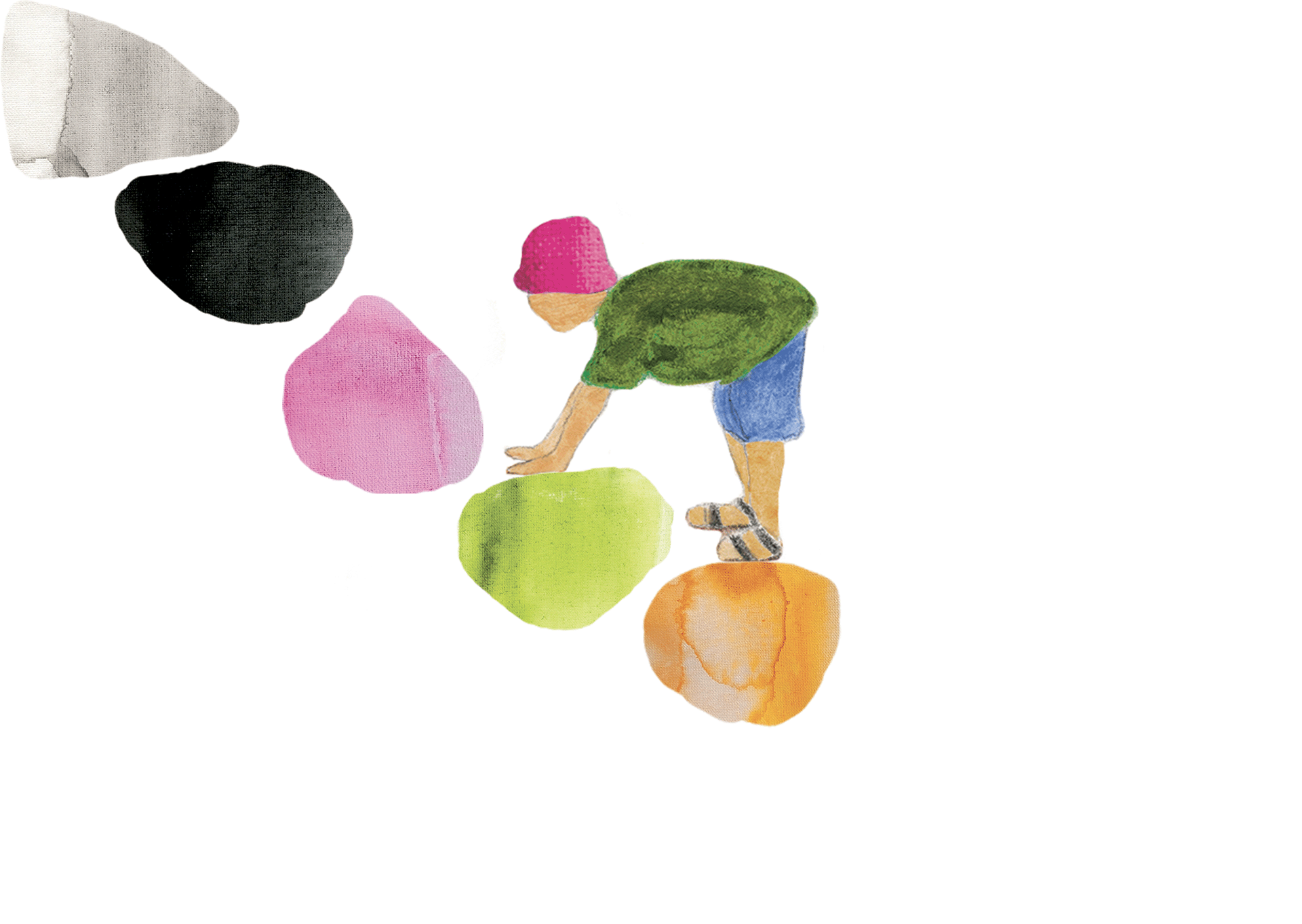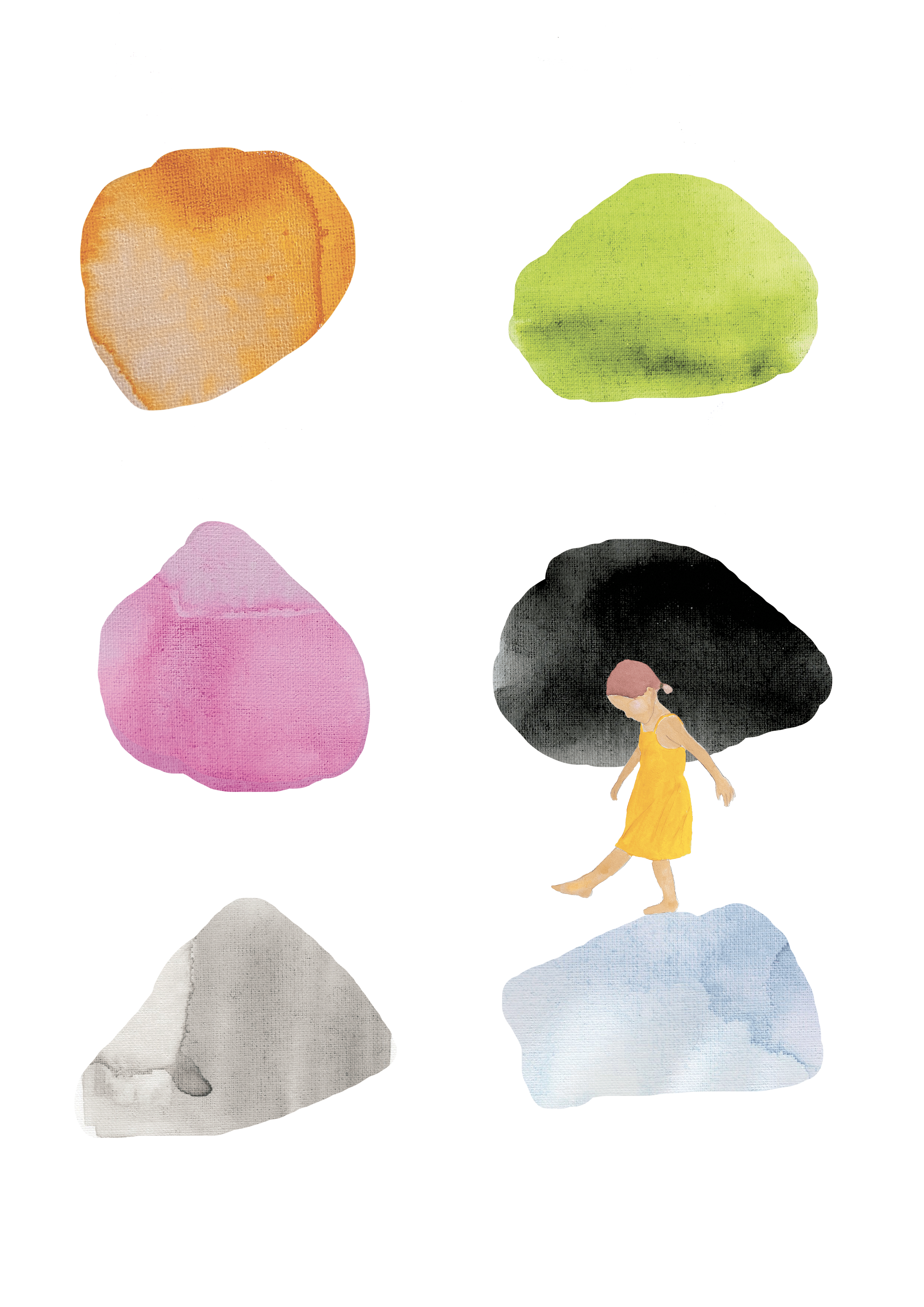 Ces illustrations mettent en scène deux enfants en mouvement sur des rochers. Elles intègrent deux techniques : le crayon de couleur et la peinture. Les pierres sont réalisées à partir de textures d'aquarelle préalablement scannées.